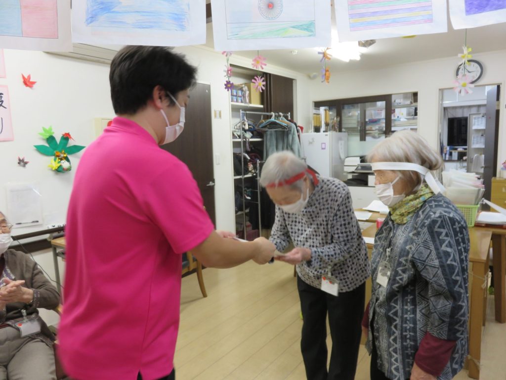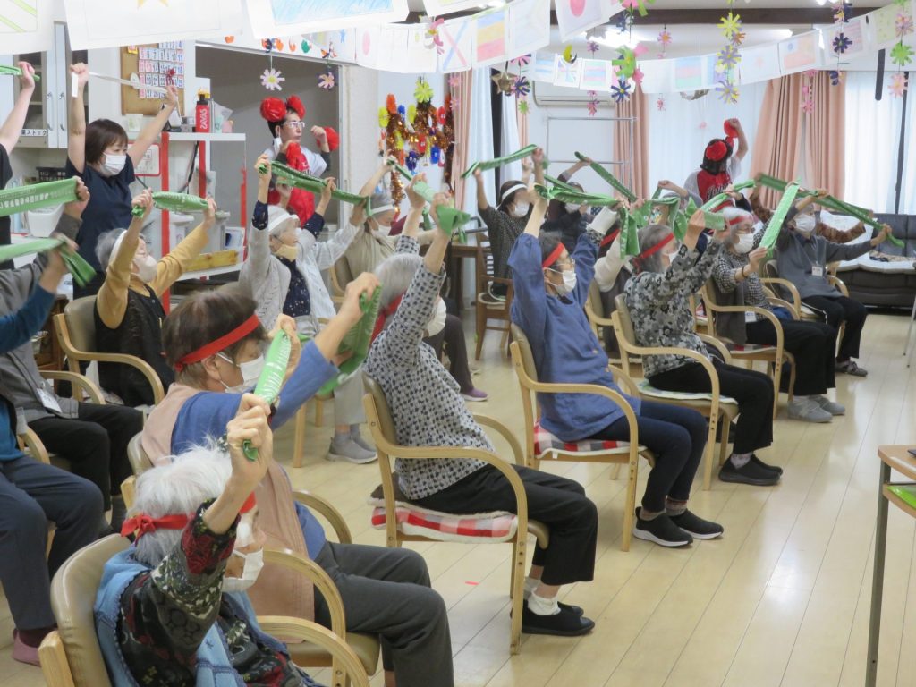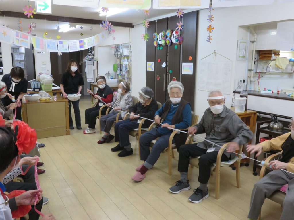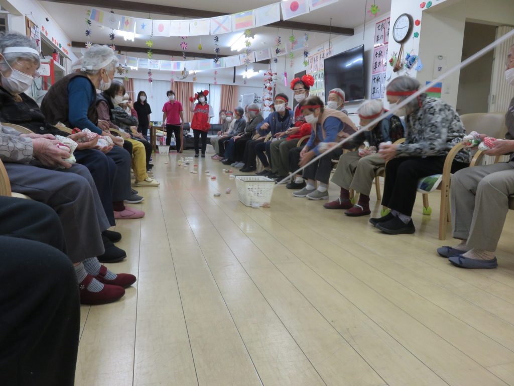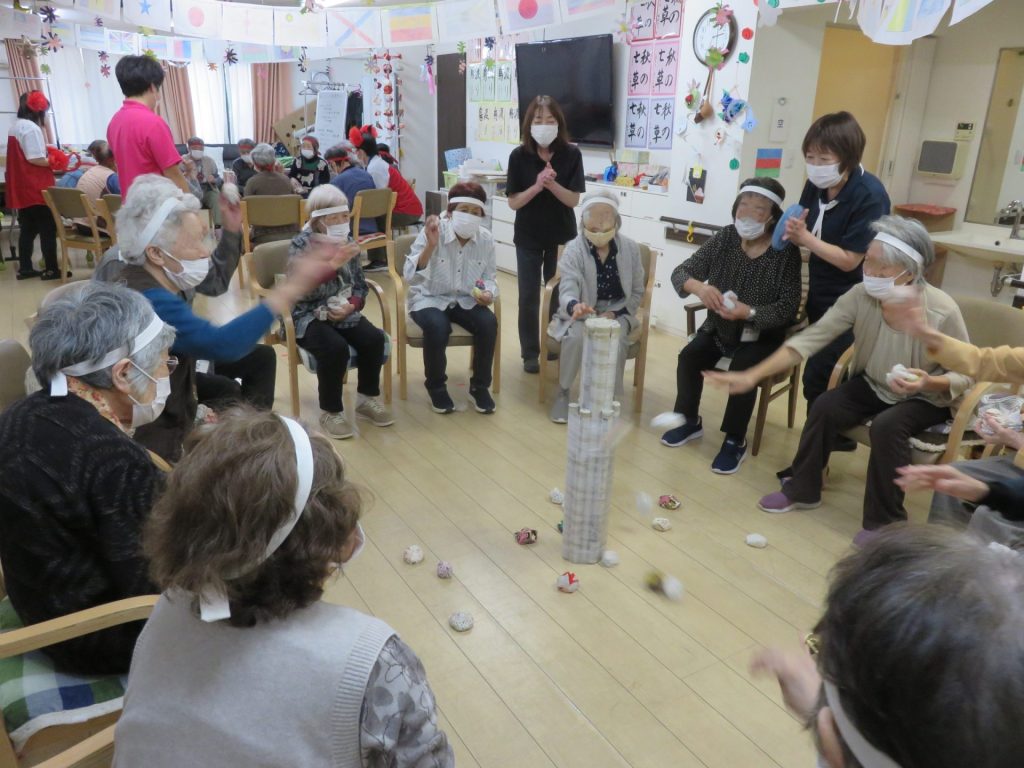 年に一度のスポーツ大会!紅白に分かれ勝敗を競い合いました 準備体操は「かめ亀手ぬぐいサイズ」 「物送りリレー」 紐を端まで渡し、形の違う物を端まで早く送るゲーム 「棒倒し」 お手玉を投げて早く棒を倒したチームが勝ちです これがなかなか倒れない。両チーム苦戦しています 「玉入れ」 とまとの家の玉入れのカゴは稼働式です 今年は紅組が僅差で勝ちました。チームには優勝の賞状が手渡されました シェアする