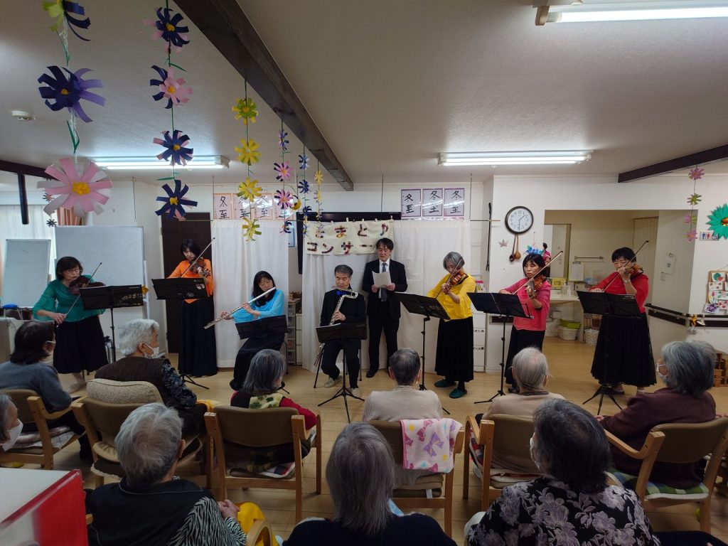 ボランティアグループ「陽だまりロンド」の皆様による演奏会を開催しました こちらでの演奏会は初めてでしたが、目の前でのバイオリンの生演奏に 皆様の眼差しも真剣です。フルートや大きなバスフルートなど珍しい楽器もあり 伴奏に合わせ一緒に歌ったりと楽しい時間を過ごしました シェアする