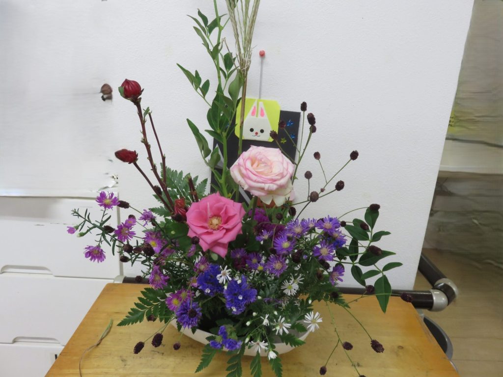 1回目の花材も素敵でしたが、2日目もシックな感じで秋を感じるアレンジです ススキをや吾亦紅、バラやハイビスカスの実などバランスを考え思い思いに活けられました 中秋の名月のこの日 ウサギもにっこりです シェアする