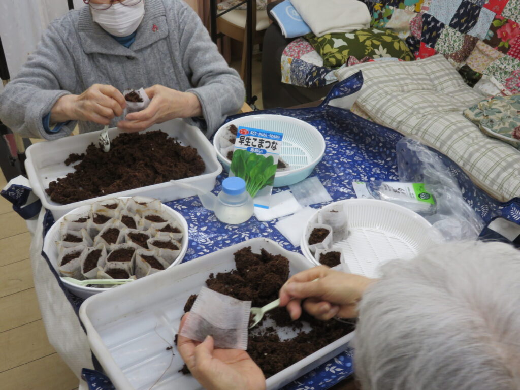 お茶のパックにスプーンで土を丁寧に入れて種を植えます