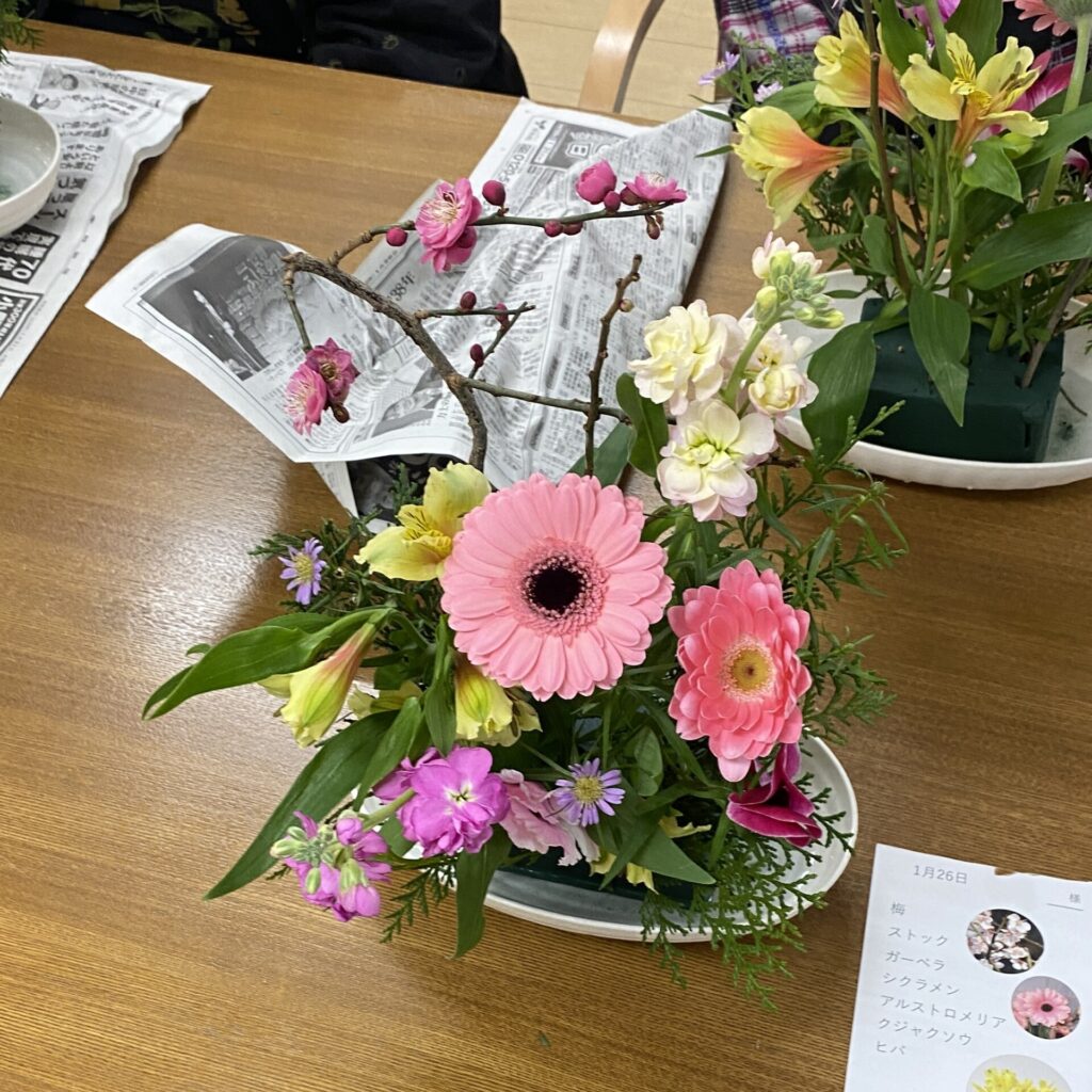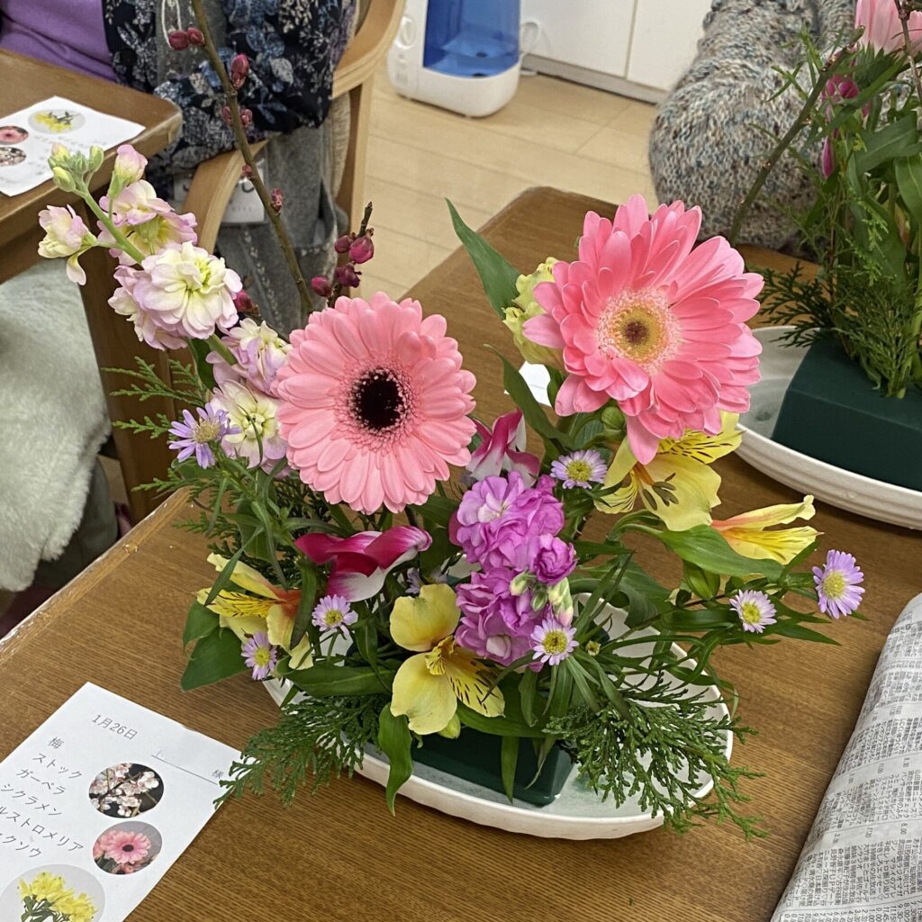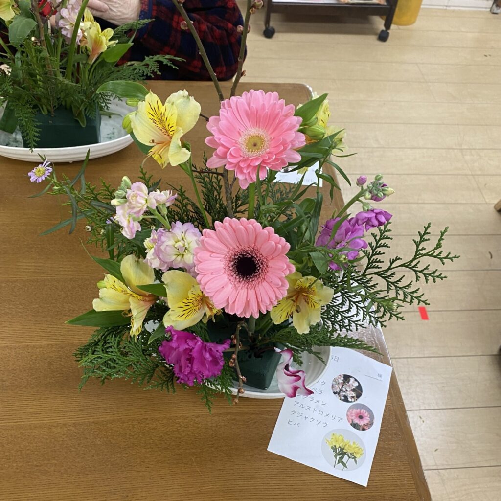 黄色のアルストロメリア、白やピンク、紫のストック、