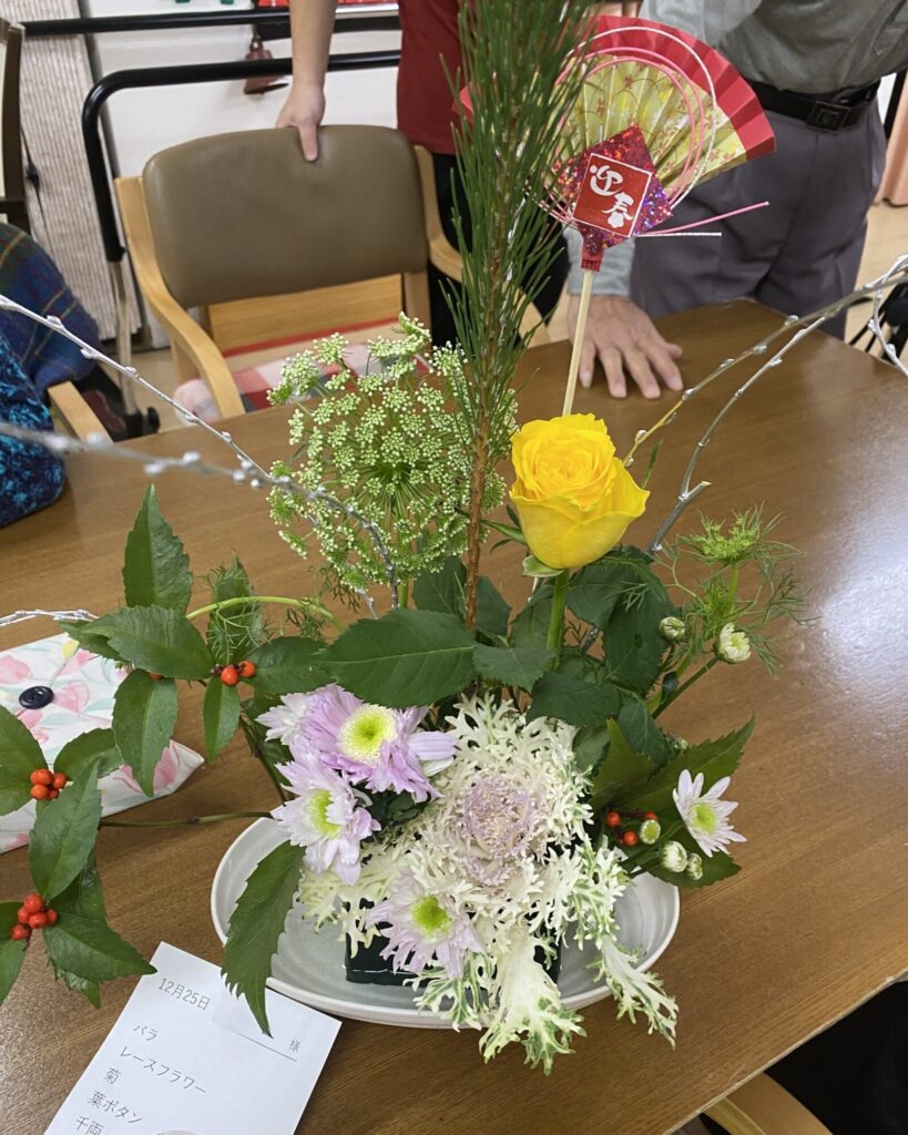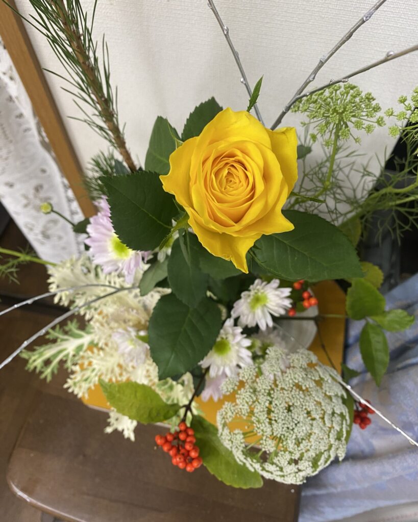 今回の花材は黄色いバラ、ピンクの菊、レースのような葉ぼたん、